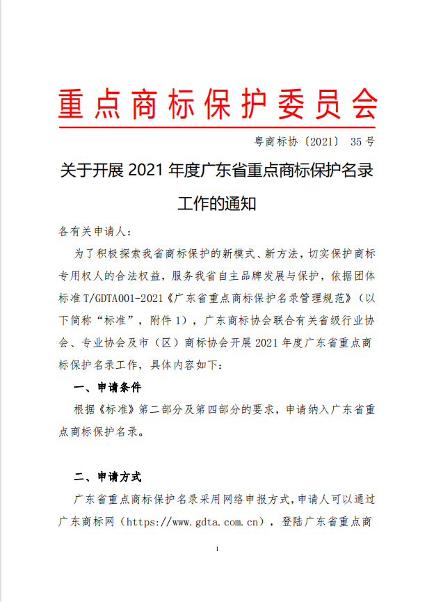 近日,廣東商標(biāo)協(xié)會(huì)發(fā)布《關(guān)于開展2021年度廣東省重點(diǎn)商標(biāo)保護(hù)名錄工作的通知》。具體詳情如下:
