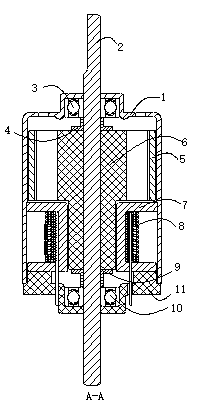 S6:將后端蓋(11)套設(shè)在轉(zhuǎn)軸(2)上、然后固定在機殼(1)上,由二者共同將套設(shè)在轉(zhuǎn)軸(2)上的導(dǎo)磁磁芯(6)及線圈骨架(7)準確定位,完成微型擺動馬達的整體裝配。