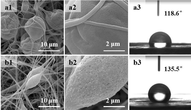 其中,疏水性納米纖維及該層中各納米纖維之間的噴霧珠粒、納米纖維上的工程珠串結(jié)構(gòu),共同形成薄疏水層,以及朝向所述納米纖維Janus膜外側(cè)表面的多級表面粗糙度;
