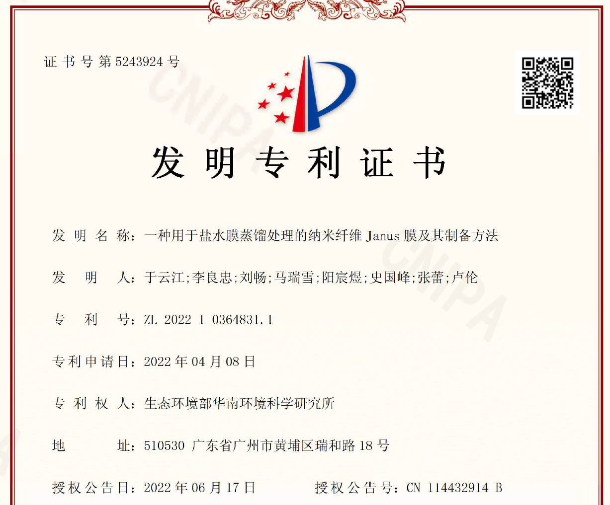 2個月發(fā)證:一種用于鹽水膜蒸餾處理的納米纖維Janus膜及其制備方法(華南環(huán)境科學(xué)研究所)