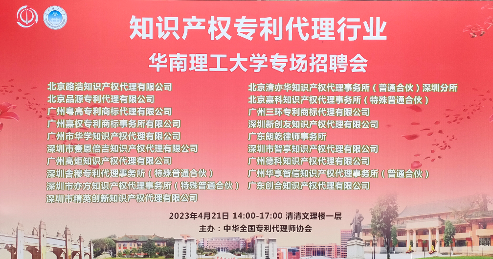 4月21日我司派員參加了中華全國代理師協(xié)會(huì)組織的行業(yè)優(yōu)秀專利代理機(jī)構(gòu),在華南理工大學(xué)舉辦的行業(yè)專場招聘會(huì),本次招聘會(huì)是協(xié)會(huì)今年知識產(chǎn)權(quán)宣傳周的前序活動(dòng)之一,是連接高校與專利代理機(jī)構(gòu)之間的重要紐帶,為廣大優(yōu)秀學(xué)子提供了一個(gè)展示自我的平臺。