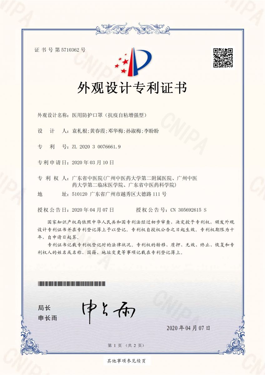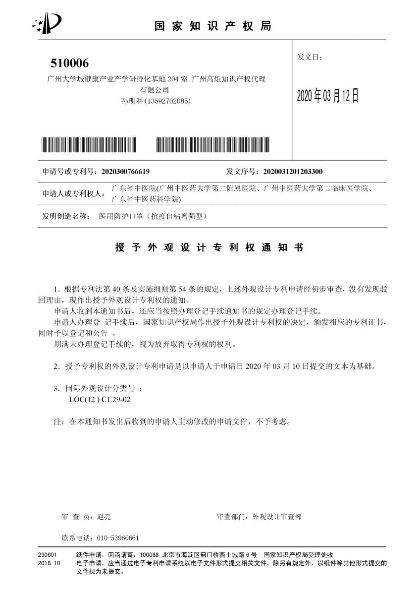 我司于2020年3月10日將本外觀專利申請文件正式報交給國家知識產(chǎn)權(quán)局,當(dāng)日被受理,專利申請?zhí)?/span>202030076661.9,專利名稱:醫(yī)用防護(hù)口罩(抗疫自粘增強(qiáng)型)。