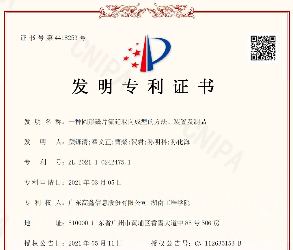 2個月發(fā)證:一種圓形磁片流延取向成型的方法、裝置及制品(湖南工程學(xué)院)