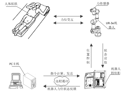 1.一種基于接觸動(dòng)力學(xué)模型的肌膚材質(zhì)力學(xué)性能測(cè)量方法,其特征在于,其包括以下步驟:步驟1:將肌膚作業(yè)對(duì)象空間位置坐標(biāo)及力學(xué)性能測(cè)量所需的肌膚表面下壓深度輸入PC主機(jī)端控制程序;步驟2:機(jī)器人在PC端遠(yuǎn)程位置控制程序的控制下移動(dòng)到作業(yè)對(duì)象表面;步驟3:控制程序按照設(shè)定的下壓深度計(jì)算目標(biāo)運(yùn)動(dòng)位置,輸入位置控制模塊控制機(jī)器人末端從肌膚表面沿著肌膚法向進(jìn)行下壓,保證最終的按壓深度達(dá)到設(shè)定值;步驟4:機(jī)器人沿肌膚法向進(jìn)行下壓運(yùn)動(dòng)的同時(shí),機(jī)器人狀態(tài)采集與發(fā)送程序以125HZ高頻率地采集機(jī)器人末端法向受力及位置信息,并實(shí)時(shí)發(fā)送回PC端;步驟5:根據(jù)肌膚力學(xué)性能的研究建立肌膚接觸動(dòng)力學(xué)模型,并使用基于肌膚接觸動(dòng)力學(xué)模型的自擾動(dòng)遞推最小二乘算法在步驟4獲取機(jī)器人末端法向受力及位置信息的同時(shí),實(shí)時(shí)辨識(shí)肌膚接觸動(dòng)力學(xué)模型,得出具有確定參數(shù)的肌膚力學(xué)性能數(shù)學(xué)表征;步驟6:機(jī)器人完成受力及位置信息采集并退出接觸,運(yùn)動(dòng)到安全位置。