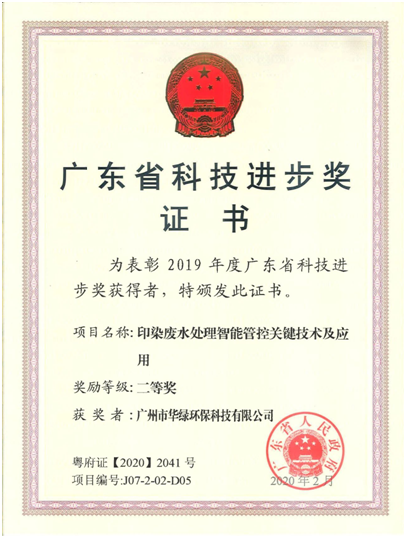 華綠環(huán)保作為主要完成單位之一在“印染廢水處理智能管控關鍵技術及應用”項目上榮獲2019年廣東省科技進步獎二等獎。同時,華綠環(huán)保負責人顧曉揚、姜元臻別獲得2019年廣東省科技進步獎二等獎個人獎。