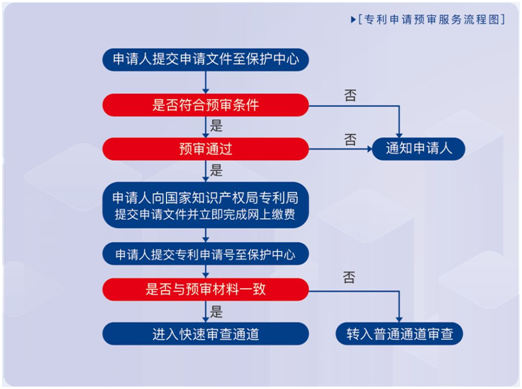 各地知識產(chǎn)權(quán)保護(hù)中心對規(guī)定技術(shù)領(lǐng)域的備案主體請求加快審查的發(fā)明、實(shí)用新型、外觀設(shè)計專利申請,提供預(yù)審服務(wù)。預(yù)審?fù)ㄟ^后可提交國家知識產(chǎn)權(quán)局專利局開通的快速通道加快審查。