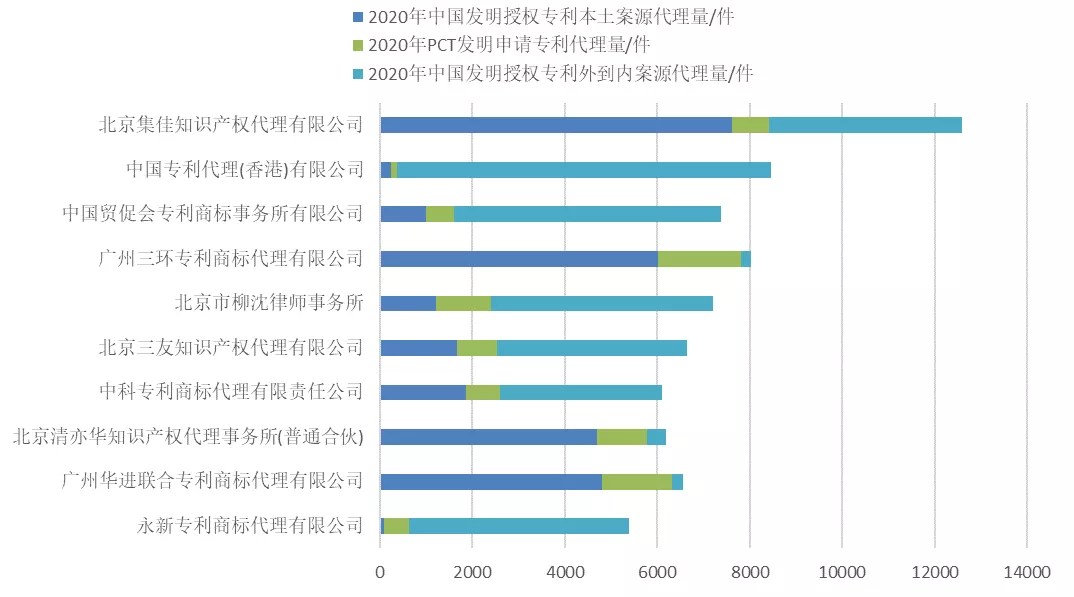 以授權(quán)公告日統(tǒng)計2020年1月1日至12月31日中國發(fā)明授權(quán)專利代理量前十名的專利代理機構(gòu),分別分析2020年中國發(fā)明授權(quán)專利本土案源代理量、2020年P(guān)CT發(fā)明申請專利代理量和2020年中國發(fā)明授權(quán)專利外到內(nèi)案源代理量。具體分布情況如下圖: